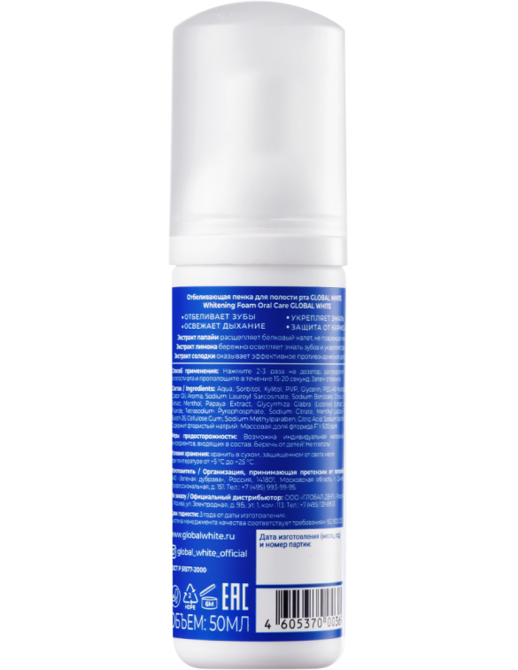 Отбеливающая пенка для полости рта Global White, 50 мл